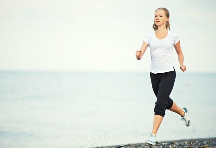 morning jog. young woman running on the beach on the coast of the Sea TFGP.