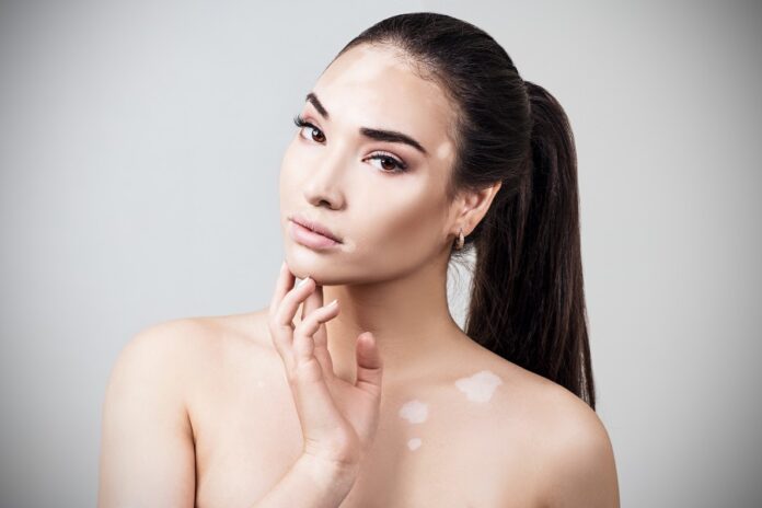 Portrait of beautiful woman with vitiligo. Over gray background.