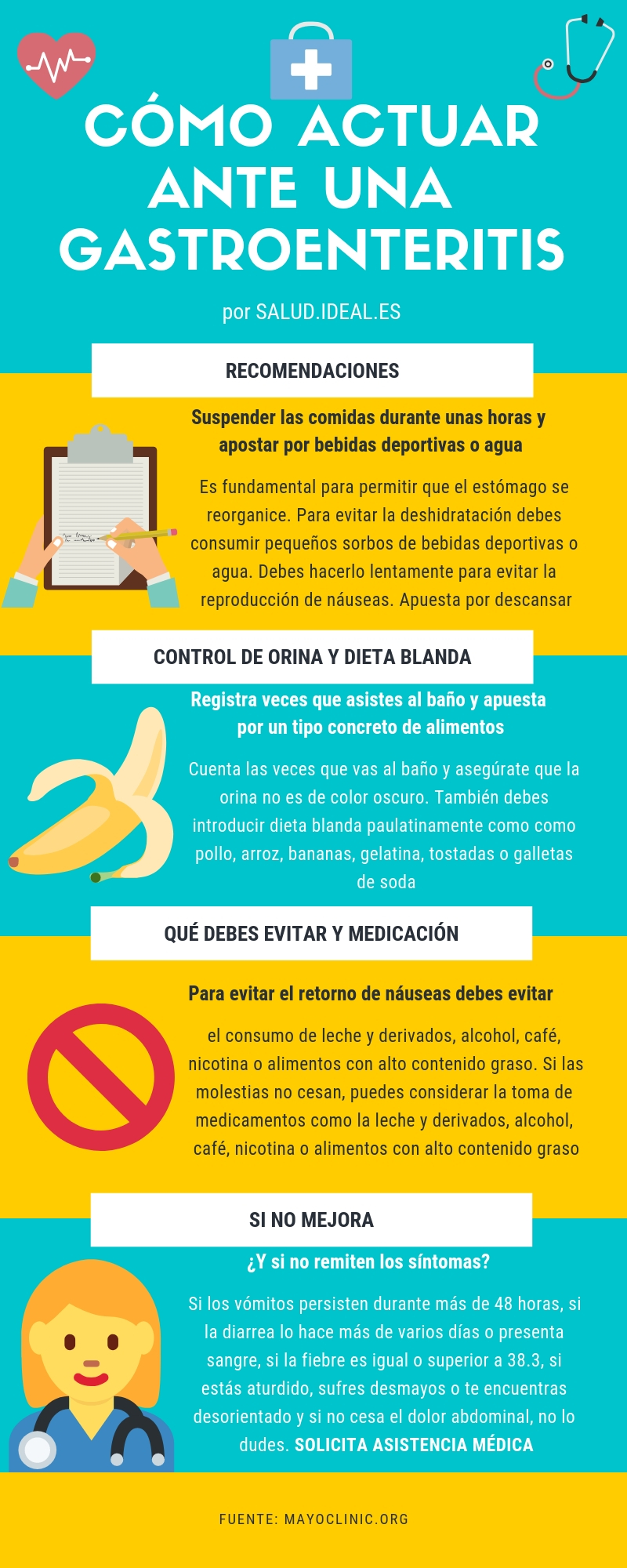 En lo que respecta a las formas de actuar contra la gastroenteritis, os dejamos esta infografía que bien sirve como resumen sobre el protocolo de actuación: