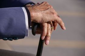 Un anciano apoya sus manos en un bastón.IDEAL.