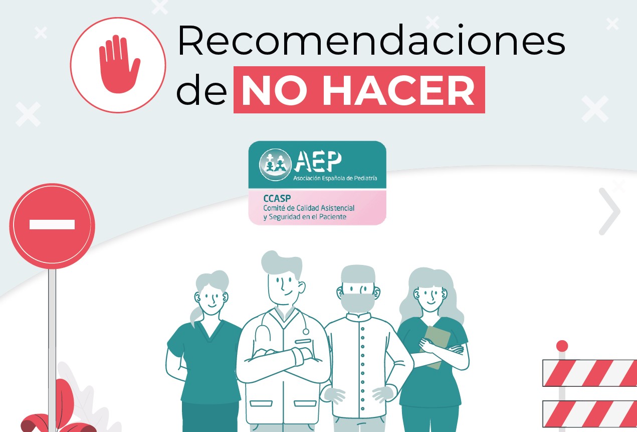 Prescribir medicamentos en cucharadas en vez de en mg, efectuar el ingreso hospitalario sin comprobar la pulsera identificativa o las alergias, prolongar la duración del tratamiento antibiótico más tiempo del recomendado, retirar el gluten de la dieta sin causa justificada o separar a un bebé recién nacido de su madre habiendo una alternativa posible. Estas son algunas de las prácticas que el Comité de Calidad Asistencial y Seguridad del Paciente de la Asociación Española de Pediatría (AEP) ha incluido en su recién publicada lista de recomendaciones de ‘NO HACER’ en los distintos ámbitos de atención pediátrica.